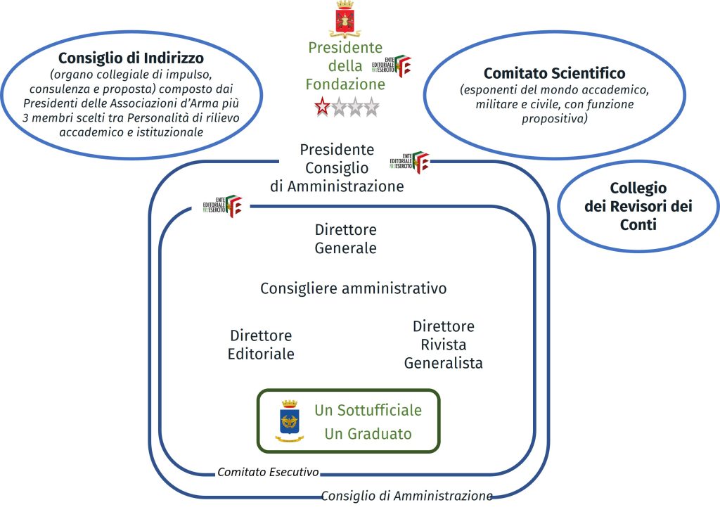 Il Consiglio di Amministrazione (composto da un Ufficiale Generale dell’Esercito non più in servizio – che lo presiede – , il Direttore Generale, il Direttore Editoriale, il Direttore della Rivista generalista, il Consigliere amministrativo, il Capo Ufficio Generale Promozione, Pubblicistica e Storia dello Stato Maggiore dell’Esercito, un Sottufficiale dell’Esercito, un Graduato dell’Esercito);